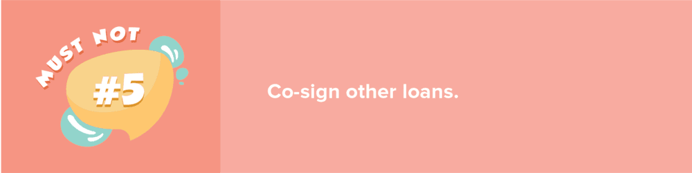 Co-signing means you are agreeing to pay off someone's debts when that person fails to make payments for any reason. And while it is a generous act, especially if it can help a family member or a friend, remember that you are still obligated. And if you’re in the process of getting a mortgage, co-signing a loan is a big NO even if you swear that you’ll not be the one making payments. Co-signing is automatically a red flag on the eyes of a lender.